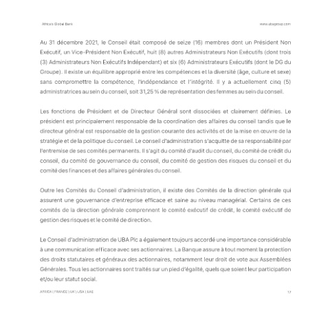 Le Conseil dʼadministration de UBA Plc a également toujours accordé une importance considérable