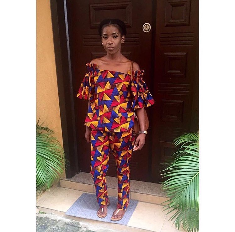 9: Ankara Print off the shoulder top and pants paired with sandals and a purse