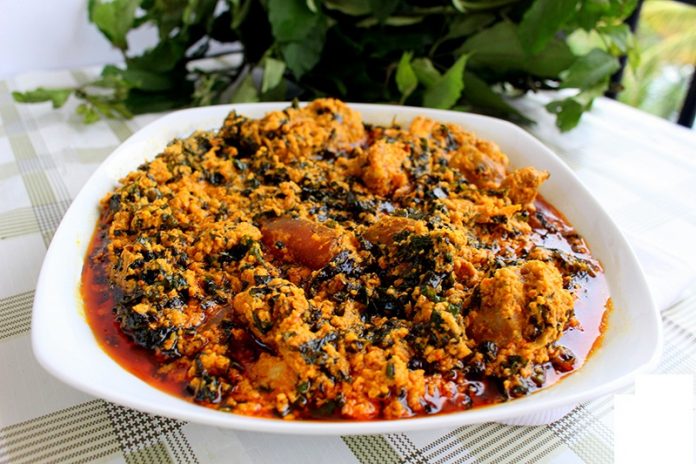 Beneath is a yummy bowl of egusi or as some other African tribes call it Melon seed garnished with Pomo, Cow leg, beef and greens and a Large bowl of Vegetable common in the Efik/Ibiibio regions of Nigeria as Edikainking and we are asking what would your rather pair with your choice of a swallow.