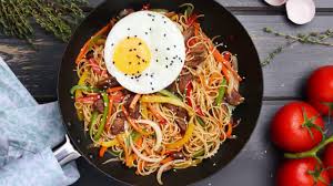 INGREDIENTS100g spaghetti ¾ pounds beef fillet, shredded2 cloves of garlic, chopped1 medium onion, sliced1 medium carrot, julienne slices1 medium green bell pepper, julienne slices1 medium yellow bell pepper, julienne sliced1 red chili, chopped.1 egg, for sunny-side upBlack & white sesame seeds(opt)1 cube beef seasoningVegetable oil