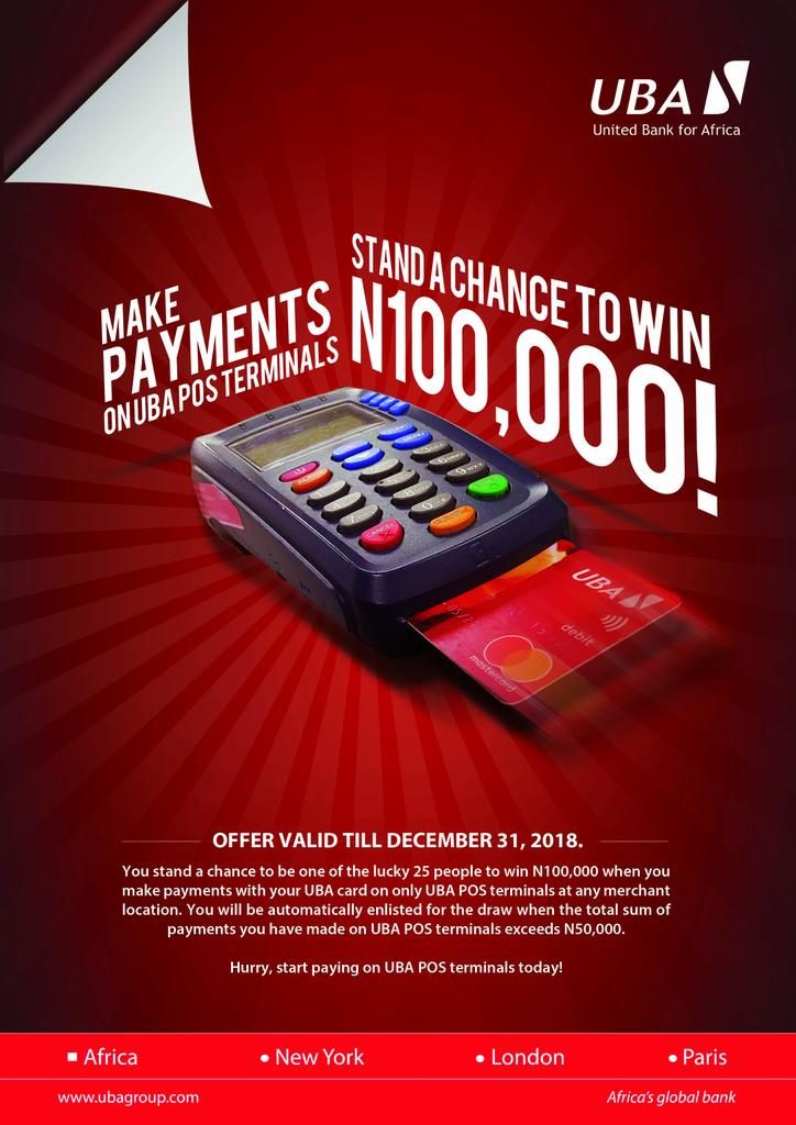 In a bid to further encourage payments on its PoS terminals, Pan African Financial services group, United Bank for Africa has announced that it will be rewarding 25 lucky customers with N100,000 each when they make payments with their UBA cards on only UBA POS terminals at any merchant location.