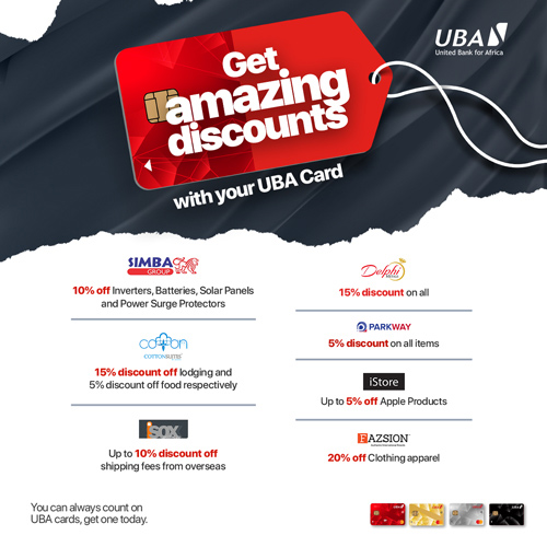 - At the till, before payment, the customer provides the cashier with the discount code UBA10 or presents their UBA Debit card.