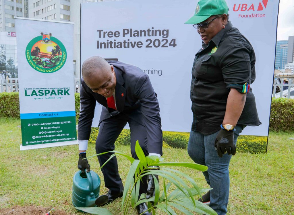 Group Managing Director/Chief Executive Officer, United Bank for Africa (UBA) Plc. Oliver Alawuba and Head of Tree Planting and Maintainance, Lagos State Parks and Gardens Agency, Mrs. Funto Aina at the flag-off of UBA Foundation’s Tree Planting Initiative, where the Bank plans to plant 2 million threes across Africa in 2024, held at the UBA Foundation Garden in Marina, Lagos
