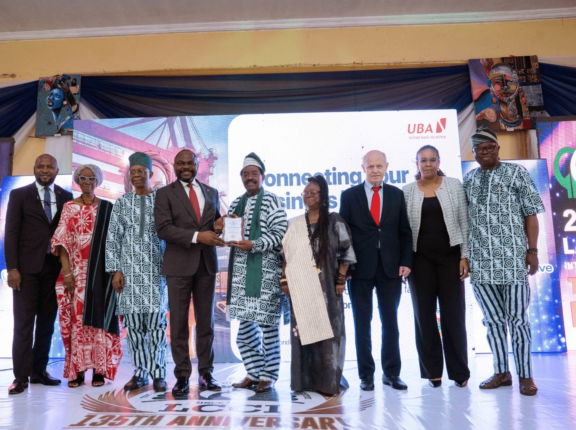 L-R: Head, Corporate & Other Collections, Abubakar Sanni; Honorary Life Vice President, Shade Bembatoum Young; Deputy President, Lagos Chamber of Commerce and Industry(LCCI), Gabriel Idahosa, FCA; Deputy Managing Director, United Bank for Africa, Muyiwa Akinyemi; President, LCCI, Asiwaju (Dr) Michael Olawale-Cole, CON; Former President, LCCI, Toki Mabogunje, Deputy President, LCCI, Knut Ulvmoen; Group Head, Marketing & Corporate Communications, Alero Ladipo and Vice President, LCCI, Leye Kupoluyi, during the commemoration of Africa Day at the ongoing 37th Lagos International Trade Fair held in Lagos on Thursday